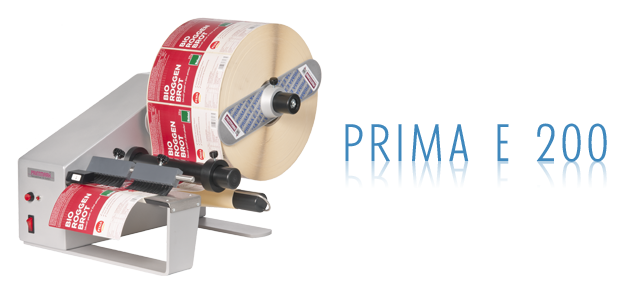 Elektrischer Etikettenspender Prima E 200 Die Modelle der PRIMA E-Serie sind halbautomatische Spender für selbstklebende Etiketten auf Rollen. Sie sind robust gefertigt, einfach zu bedienen und flexibel geeignet für jede Art von Endlosetiketten auf Trägerpapier. Der Rollenhalter kann für jeden Rollenkern von Ø 38-110 mm verwendet werden und nimmt maximale Außendurchmesser von bis zu 300mm auf. Zwei intelligente Sensoren dienen der Etikettenabtastung. Eine Teachfunktion (Kalibrierung) erkennt den Unterschied zwischen der Transparenz des Trägerpapiers und dem Etikett. Das Etikett wird über die feststehende Spendekante hinaus soweit vom Trägerpapier abgelöst, dass es manuell leicht zu entnehmen ist. Mit der Entnahme wird automatisch das nächste Etikett vorgespendet. Im Anschluss wird das Trägerpapier wieder aufgewickelt. Das Zusammenspiel von integrierter Steuerung und motorischem Antrieb gewährleistet einen stets gleich bleibenden Spendeprozess. Geht die Etikettenrolle zu Ende oder ist das Etikettenmaterial stark beschädigt, stoppt der Spender mit einem Warnsignal. Eine elektromechanische Abtastung für transparente Etiketten und ein Zähler sind optional erhältlich.